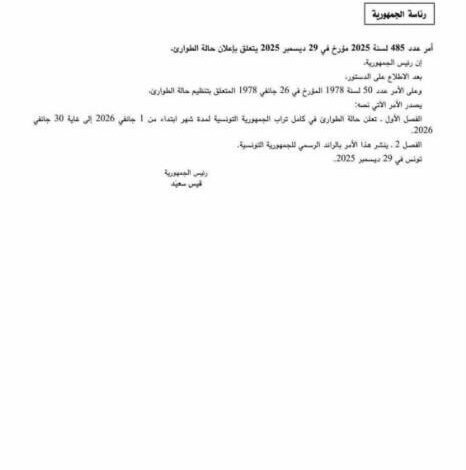 وأفاد الأمر الرئاسي بأنه “تعلن حالة الطوارئ في كامل الجمهورية التونسية ابتداء من 1 يناير 2026 إلى غاية 30 من الشهر نفسه”.